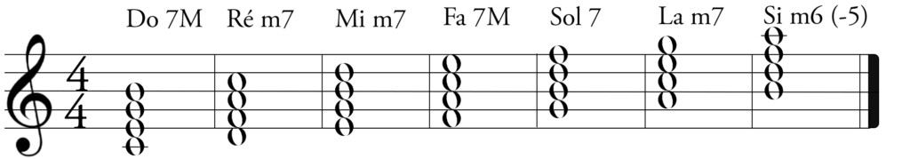 On construit les accords de 4 notes en ajoutant une tierce majeure ou mineure au quatre accords de trois notes formés précédemment avec des tierces.