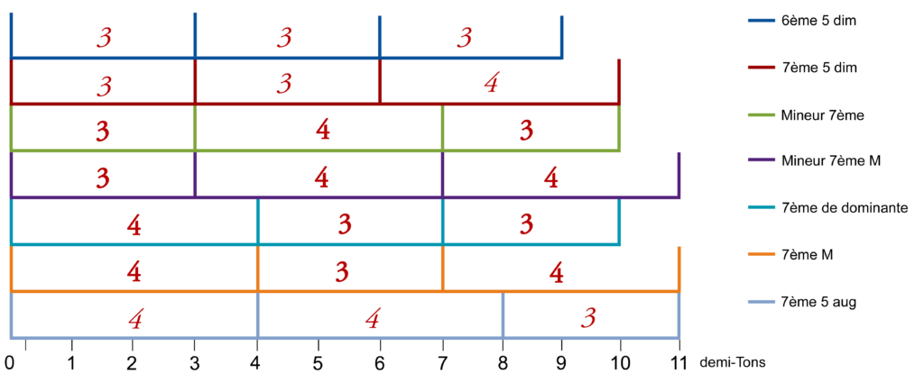 La somme des intervalles est de 9, 10, 11 ou 12 demi-Tons. La dernière note de l’accord est donc une sixième, une septième de dominante, une septième majeure ou une octave.