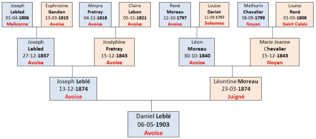 Un coup d’œil rapide montre que les Leblé sont tous sarthois, nés et mariés à Ligron, Mézeray, Malicorne, Noyen et Avoise. 20 kilomètres à vol d’oiseau entre Ligron et Avoise !