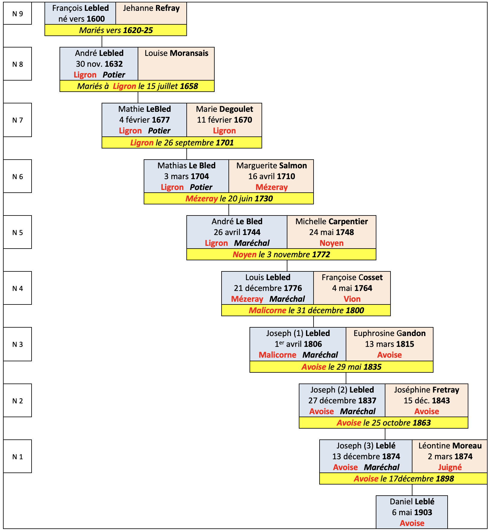 Les Leblé les plus anciens sont tous potiers à Ligron. Tous les suivants ont été maréchaux à Mézeray, Malicorne puis Avoise. Daniel, après un apprentissage de maréchal, a exercé plusieurs métiers. Ses mémoires, accessibles sur ce site, racontent sa vie personnelle et professionnelle.