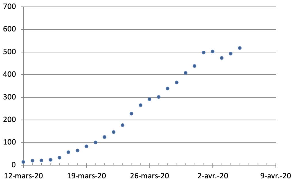 J’en profite pour vous remettre ici le graphe du nombre de mort quotidien où le palier qui semblait se dessiner il y a deux jours est en train de disparaître.