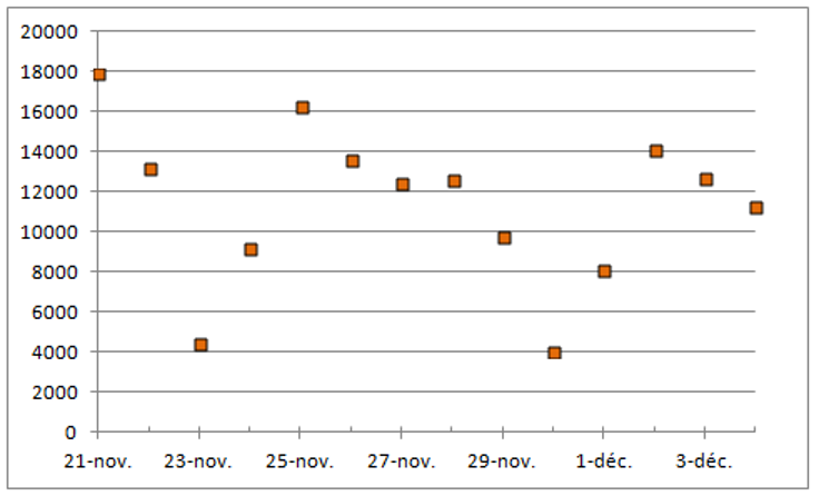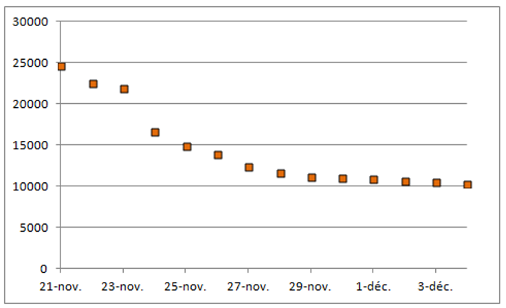 Qu’en pensez-vous ? Voyez-vous une baisse ? Certes, nous sommes déjà descendus sous les 5000 cas évoqués par notre Président. Mais il ne lit pas mes chroniques, contrairement à ce qu’un farceur (l’un d’entre vous) a voulu me faire croire au téléphone la semaine dernière. Si on fait la moyenne des 7 derniers jours, voilà les points que l’on obtient.